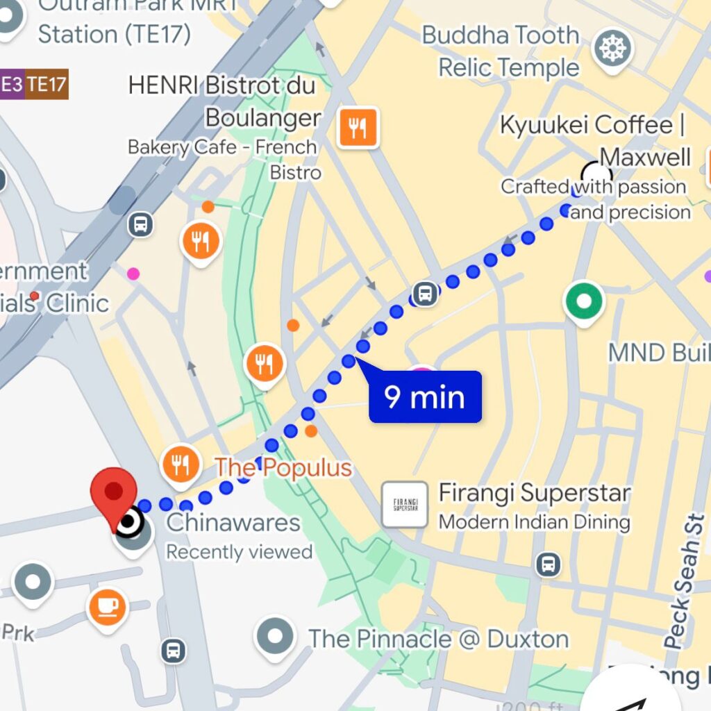 9 minute walk from Maxwell Station along Neil Road towards Pinnacle @ Duxton.